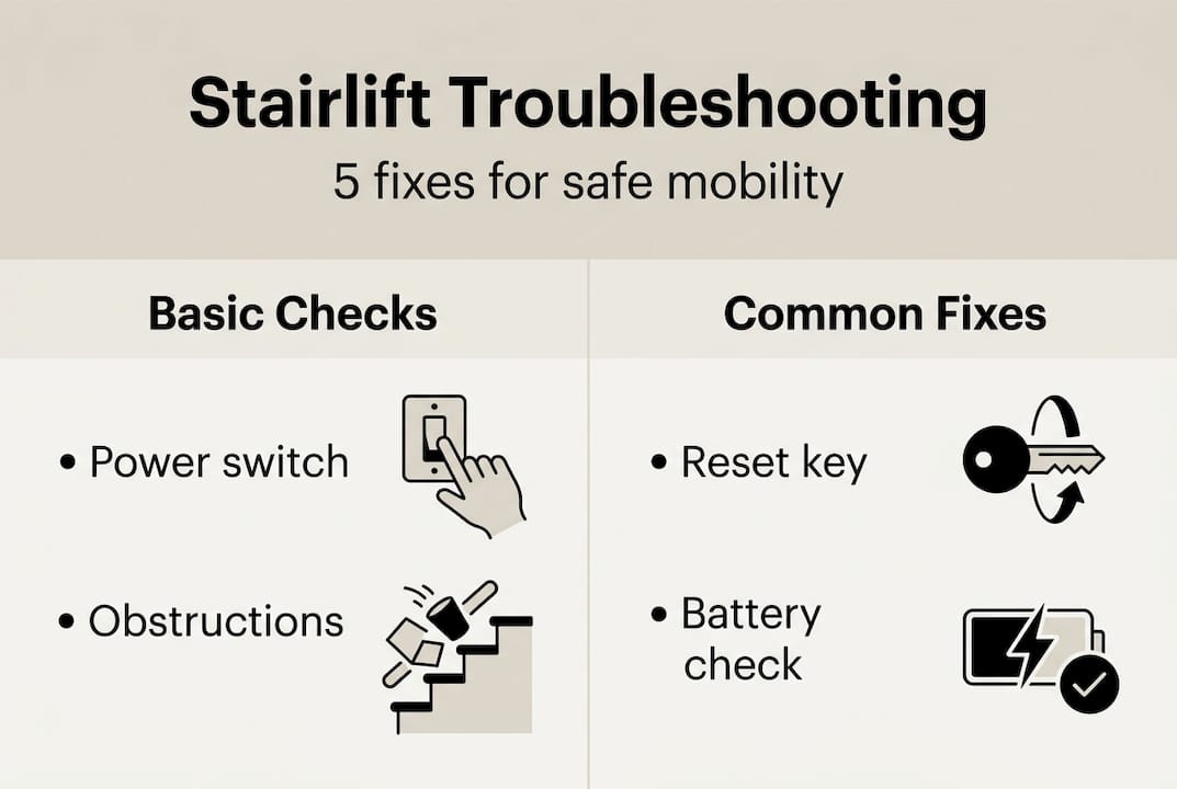 | Check basics first | Most stairlift issues are resolved by verifying power and clearing minor obstructions. |