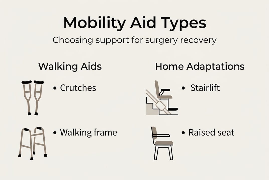 Not all mobility aids are created equal, and the best option for you depends largely on your surgery type and your home layout. Wheelchairs and stairlifts are primary aids when weight-bearing is restricted, but the supporting cast of smaller aids matters just as much.