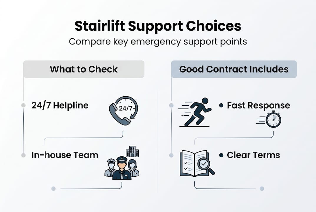 Pro Tip: When comparing providers, ask specifically whether their emergency helpline is staffed in-house or outsourced to a call centre. In-house teams who know your stairlift model can often resolve issues faster. For a broader view of what to expect from your equipment, the full stairlift guide is a helpful starting point.